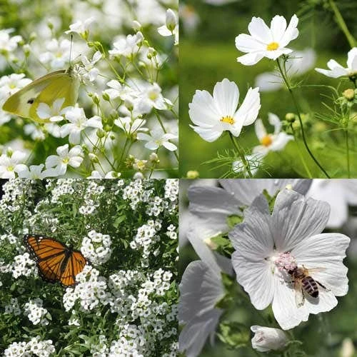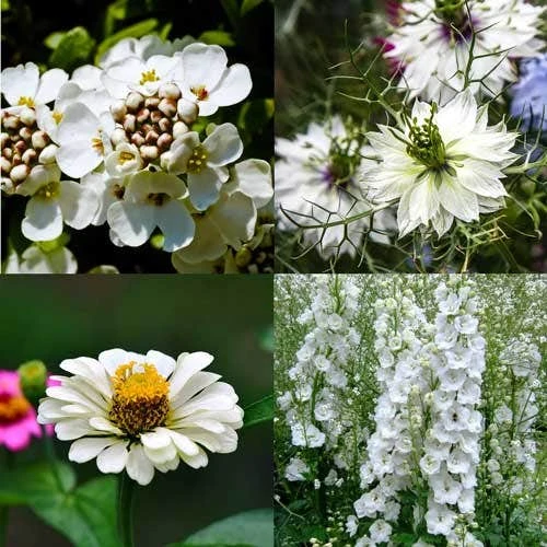 DESCRIPTION: A mixture of white flowering annuals to create contrast and add a fresh crisp look. Plant in rockeries, pots and cottage gardens. Includes : cosmos, Queen Anne’s lace (Ammi), larkspur (Delphinium), baby’s breath (Gypsophila), alyssum (Lobularia), zinnia, candytuft (Iberis), cornflower (Centaurea), mallow (Lavatera), Chinese aster (Callistephus), love in a mist (Nigella)